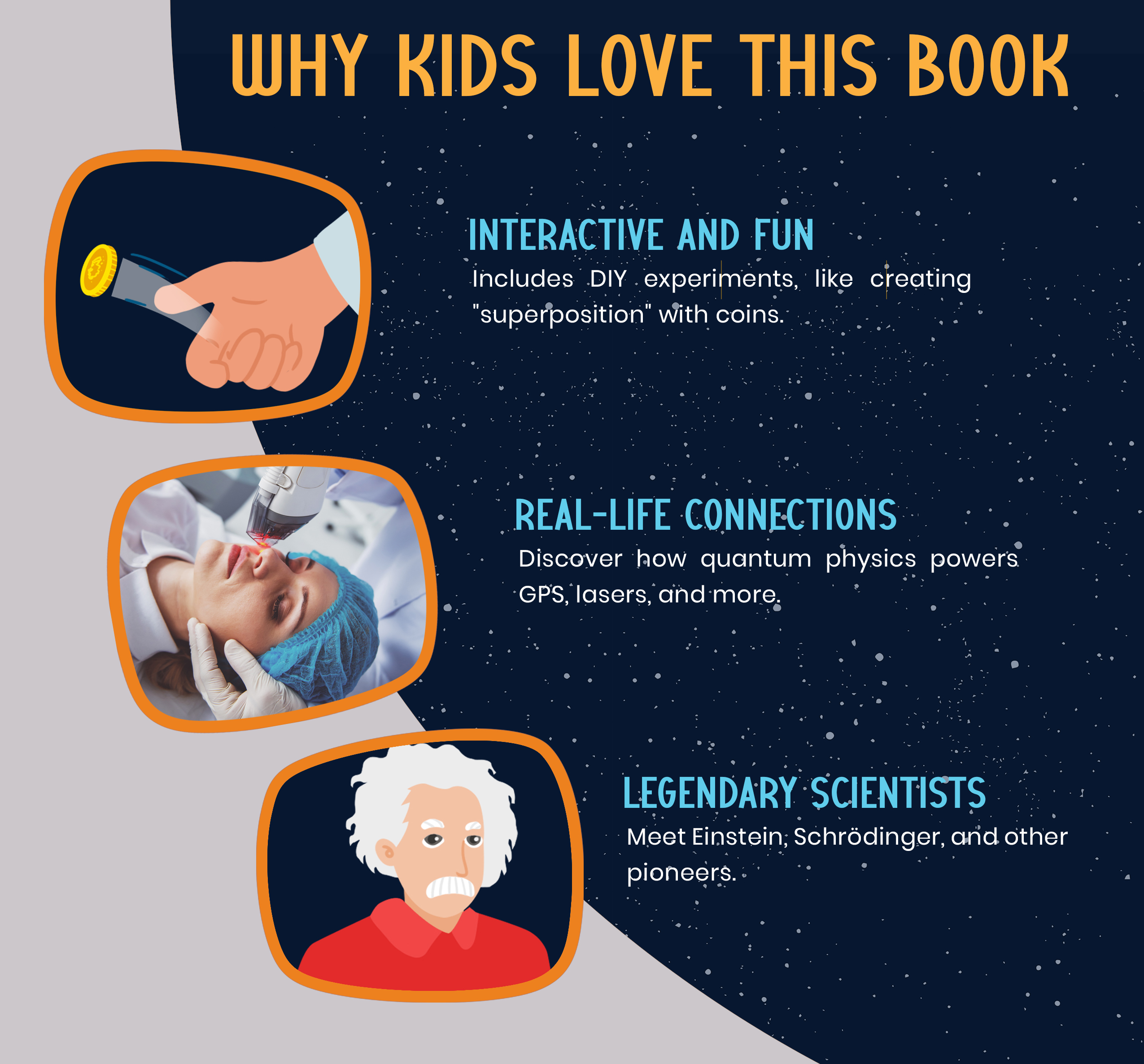 “Quantum Physics for Kids” is a carefully crafted book that bridges the gap between complex scientific concepts and young learners. It introduces children to the fascinating world of quantum physics, making ideas like superposition, entanglement, and quantum leaps easy to grasp.